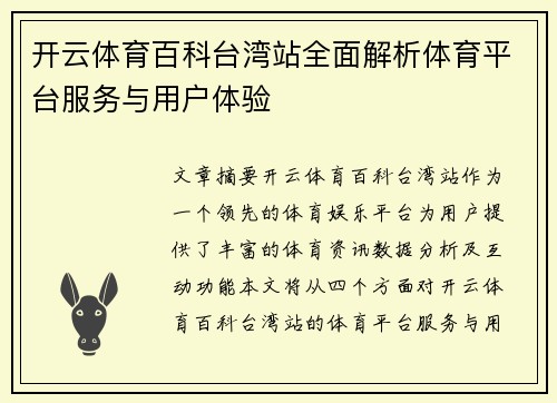开云体育百科台湾站作为一个领先的体育娱乐平台,为用户提供了丰富的体育资讯、数据分析及互动功能。本文将从四个方面对开云体育百科台湾站的体育平台服务与用户体验进行全面解析:首先,探讨平台的服务质量,包括其功能布局与信息更新速度;其次,分析平台的用户体验,尤其是其界面设计和交互性;第三,讨论平台的安全性保障措施,确保用户在参与体育活动时能够享受一个安全的环境;最后,评估平台的客户服务与支持,着重介绍如何通过平台解决用户的问题。通过这些方面的深入探讨,文章旨在为用户提供一个更全面的了解,帮助他们更好地利用开云体育百科台湾站的服务,提升整体体验。