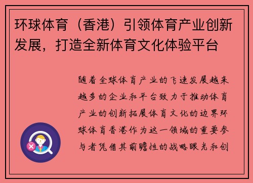 随着全球体育产业的飞速发展,越来越多的企业和平台致力于推动体育产业的创新,拓展体育文化的边界。环球体育(香港)作为这一领域的重要参与者,凭借其前瞻性的战略眼光和创新的商业模式,正在引领体育产业的新潮流。通过多元化的业务布局、科技赋能、深度融合的跨界合作以及与消费者互动的创新体验,环球体育(香港)不仅在体育赛事传播、品牌推广等传统业务领域中展现出了巨大的竞争力,还在打造全新的体育文化体验平台方面取得了显著成就。本篇文章将围绕环球体育(香港)如何推动体育产业的创新发展以及其如何通过打造体育文化体验平台进行详细探讨,文章将从四个方面逐步展开分析。