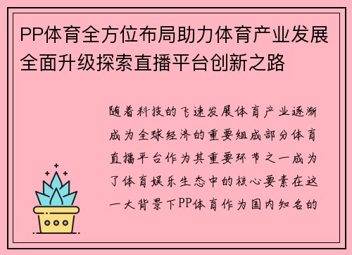 随着科技的飞速发展,体育产业逐渐成为全球经济的重要组成部分。体育直播平台作为其重要环节之一,成为了体育娱乐生态中的核心要素。在这一大背景下,PP体育作为国内知名的体育直播平台,积极展开全方位的布局,以助力体育产业的全面升级和创新发展。PP体育不仅依托强大的直播技术与内容资源优势,还在营销模式、用户体验、平台创新等方面探索新的路径,推动体育行业在数字化时代的进步。本文将从PP体育在直播平台创新、内容资源整合、营销模式创新和用户体验提升等四个方面进行详细分析,探讨其如何在竞争激烈的市场中占据一席之地,并对未来的发展趋势进行展望。